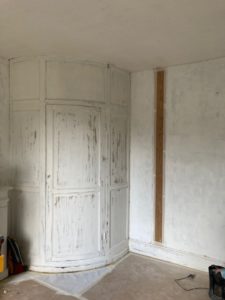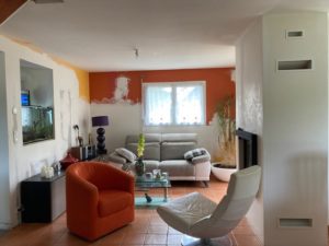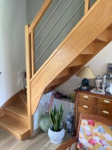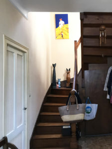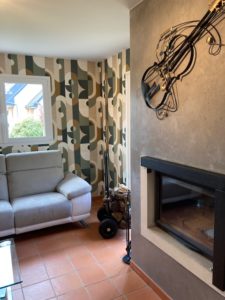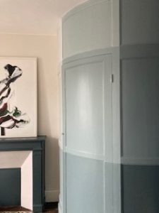 Vous pouvez voir un panoramique avec lequel nous avons repris le bleu pour moderniser « l’armoire » et pour ramener la cuisine dans l’espace un ton de vert paisible. Le doré du décor rappelle le bois, les ferrures et une ambiance chaleureuse.